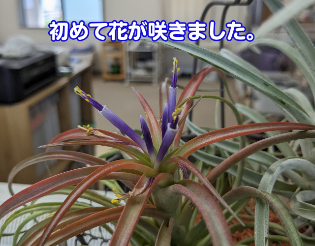 カウンターの上で6年、そのエアープランツがついに花を咲かせました!