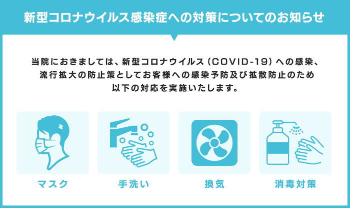 マスク着用、うがい、手洗い、換気、消毒を徹底しております。